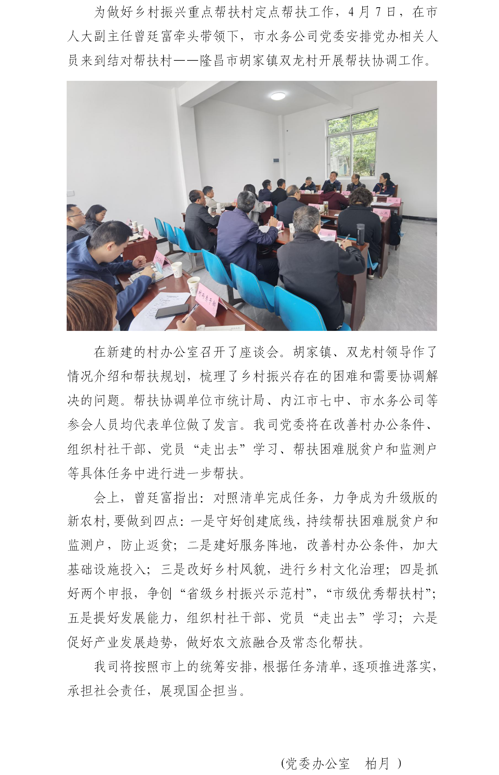 市水務(wù)公司到隆昌市胡家鎮(zhèn)雙龍村開(kāi)展幫扶協(xié)調(diào)工作