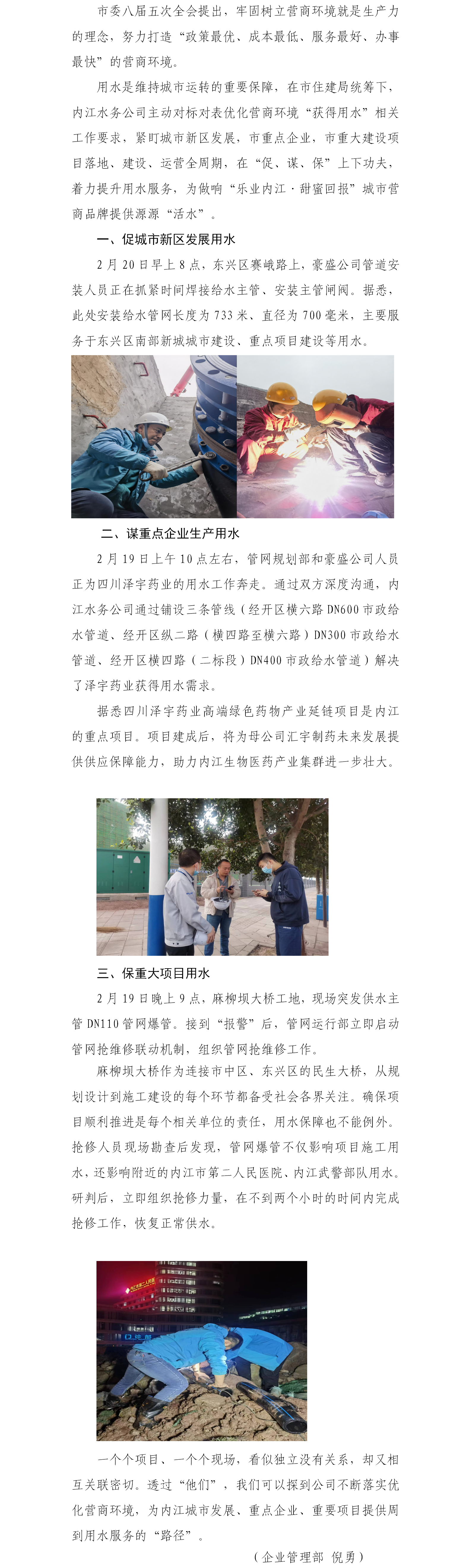 內江水務優化營商環境護航城市發展、重點企業、重大項目獲得用水