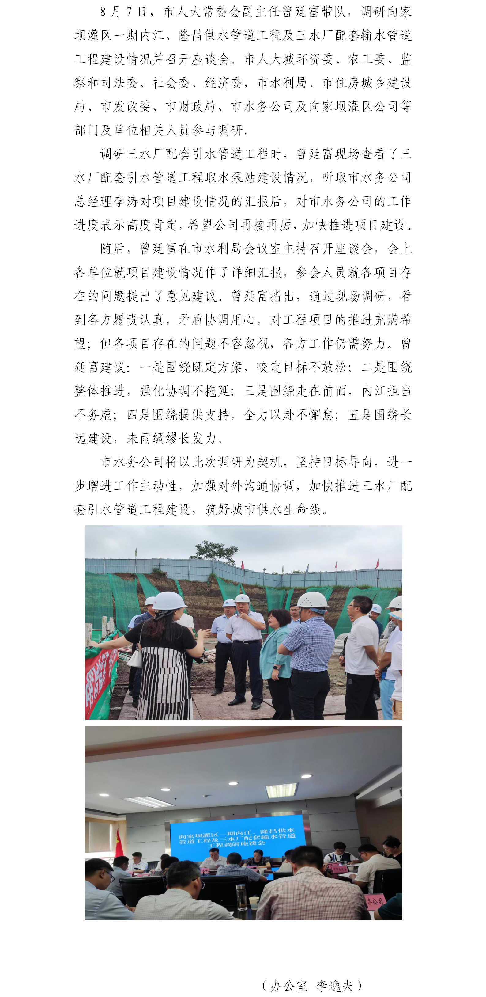 市人大常委會調研向家壩灌區一期內江、隆昌供水管道工程及三水廠配套引水管道工程