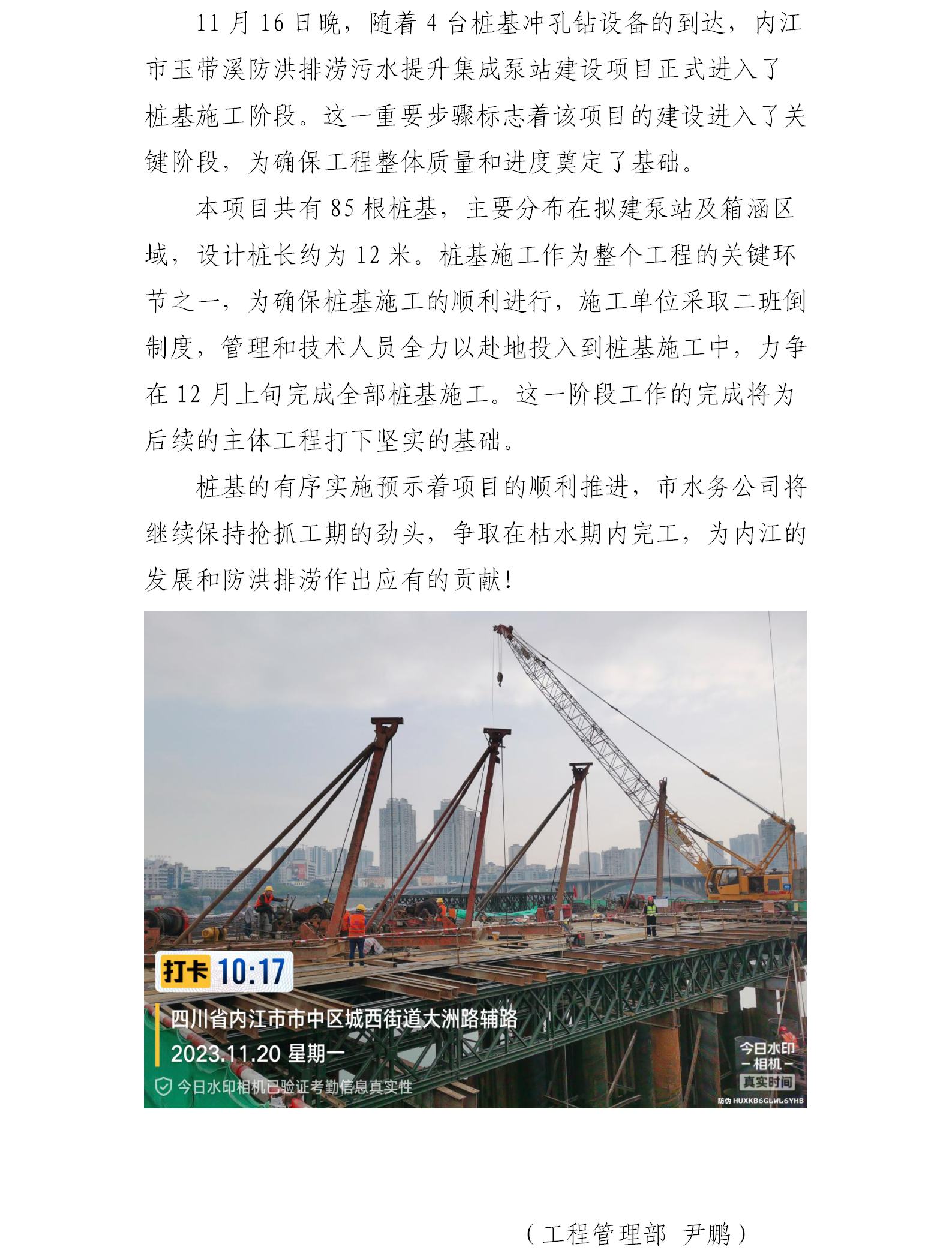 內江市玉帶溪防洪排澇污水提升集成泵站建設項目進入樁基施工階段