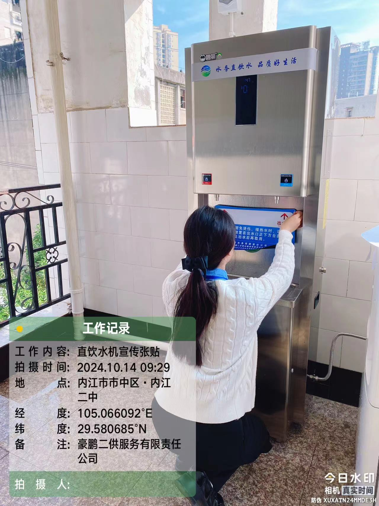 近期,內江二中(沱中路校區) 21 臺直飲水設備順利完成了安裝,豪鵬公司積極跟進完善配套服務,在直飲水設備上張貼了運維記錄表及溫馨提示。