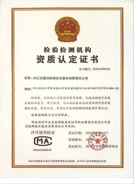 經四川省市場監督管理局批準,內江市豪潔檢測技術服務有限責任公司正式取得《檢驗檢測機構資質認定證書》,此項資質的取得標志著我司在檢驗檢測方面已達到了國家相關標準和要求,具備了向社會提供公正、準確的檢測服務資質和能力。
