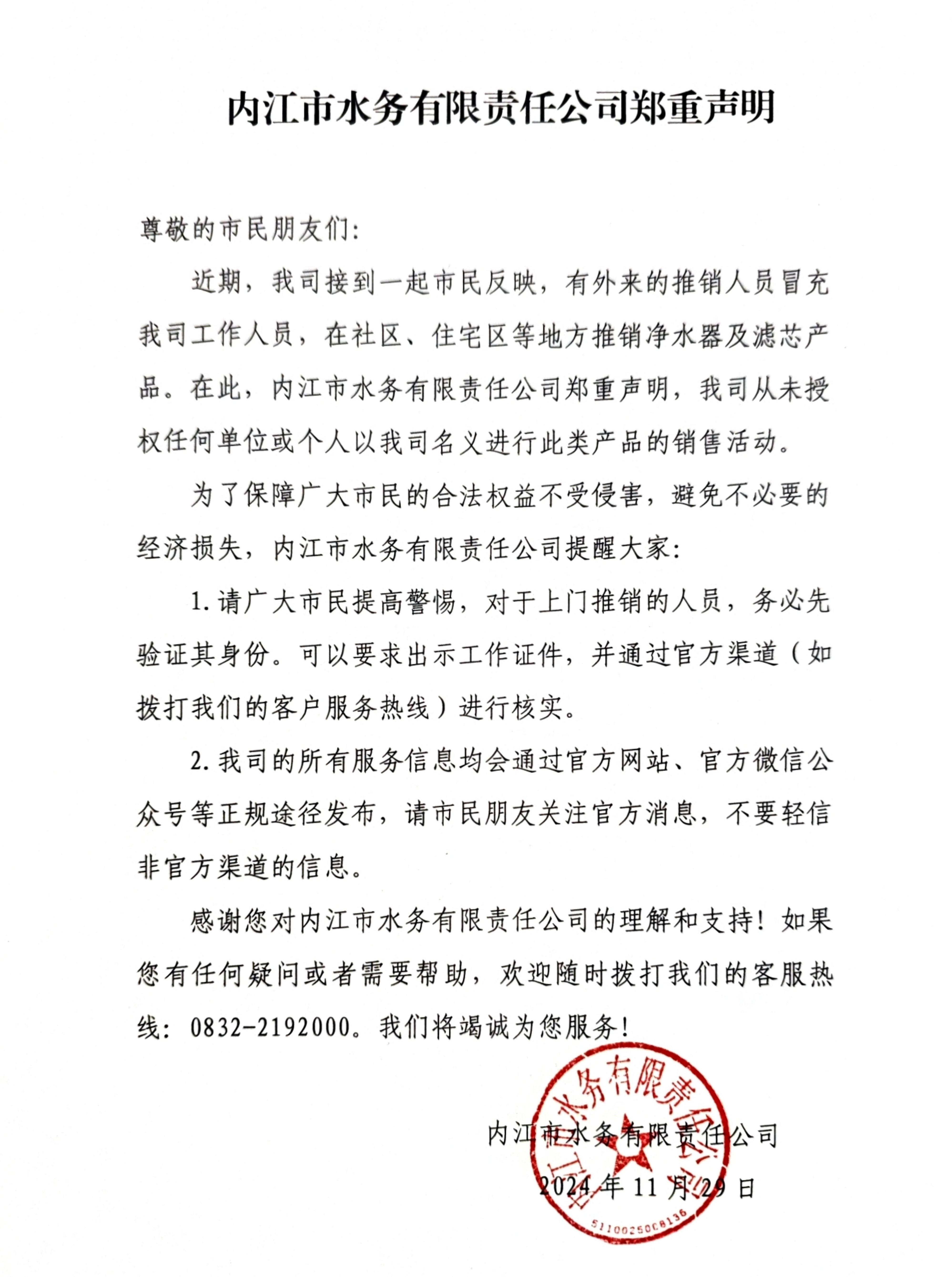 內江市水務有限責任公司鄭重聲明